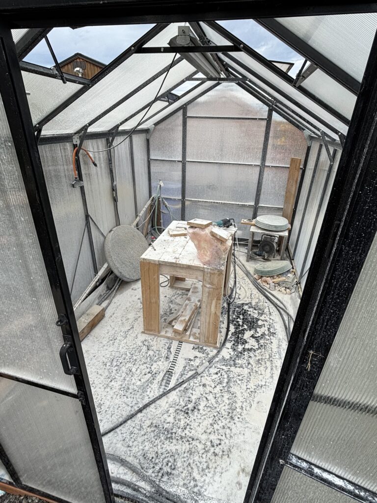 I primarily wet work stone, partially because my material choices require abrasive and cutting only, but mostly it’s because I hate dust, Yuck! While I’m sure it’s possible to adapt this studio concept to hand working and dry cutting with exhaust fans, this idea’s manifest intent is for wet work. Cold, wet and in the wind is no way to have fun–even with great rain gear it can be uncomfortable. So, I began to explore ways to make a mess away from the elements.