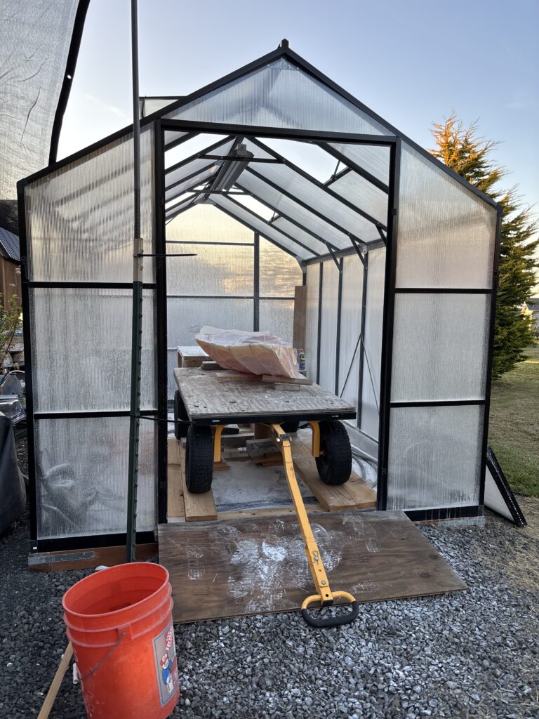 I bought some EPDM rubber pond liner and cut away a small opening right over the drain. This works like a perfect shower pan. All parts of the liner are sloped toward the drain, but it doesn’t feel like a slope when walking on it. Also, the black pond liner helps retain solar heat. I bought a relatively cheap greenhouse online and was particular about getting double doors so I can use my rock cart to roll right up to and away from the work bench. The walls are made of double-wall polycarbonate, and the rest is aluminum. It was easy to assemble. There are four roof vents that help let out excess heat.